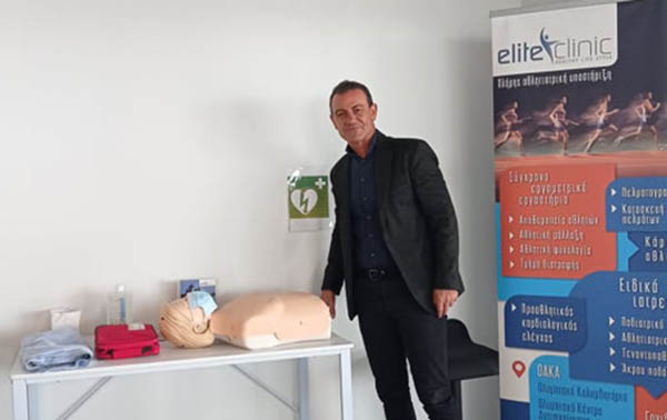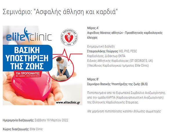 Στις 19/3/2022 διοργανώθηκε στο Eliteclinic ημερίδα σχετικά με την ασφαλή άθληση, στο πλαίσιο της οποίας  δώσαμε ομιλία σχετικά με τον αιφνίδιο θάνατο των αθλητών και τον προαθλητικό καρδιολογικό έλεγχο. Στη συνέχεια διενεργήθηκε σεμινάριο με χορήγηση πιστοποιητικού ΚΑΡΠΑ (εγκεκριμένο από το Ευρωπαϊκό Συμβούλιο Αναζωογόνησης) σε προπονητές διαφόρων αθλημάτων. Το σεμινάριο ολοκληρώθηκε με επιτυχία χάρη στην  ευγενική προσφορά και εξαιρετική παρουσίαση της ομάδας της Ελληνικής Καρδιολογικής Εταιρείας . Το Eliteclinic είναι ένας νέος χώρος που δημιουργήθηκε στο ΟΑΚΑ από εξειδικευμένους και έμπειρους επιστήμονες, στοχεύοντας στην ολιστική υποστήριξη των αθλουμένων, με εξατομικευμένες υπηρεσίες πρόληψης, διάγνωσης και αποθεραπείας.